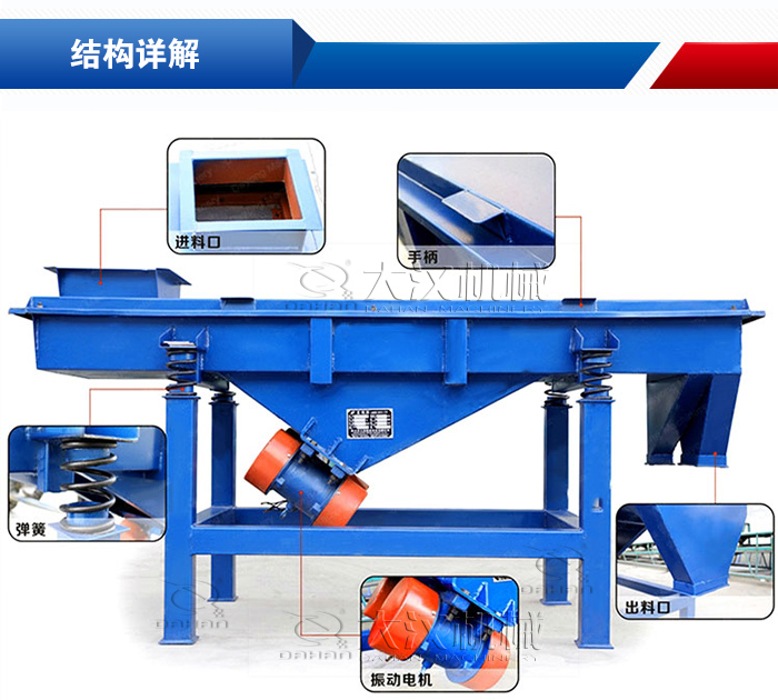 主要由筛箱、筛框、筛网、振动电机、电机台座、减振弹簧、支架等组成。
