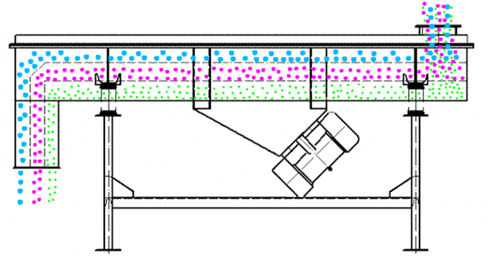 直线筛分机采用双台电机作为激振力,当两台振动电机做同步、反向旋转时,其偏心块所产生的激振力在平行于电机轴线的方向相互抵消,在垂直于电机轴的方向叠为一合力,在振动力和物料的双重作用下,将筛面上的物料抛起向前做跳跃式直线运动,通过多层筛网产生数种规格的筛上物、筛下物、分别从各自的出口排出。