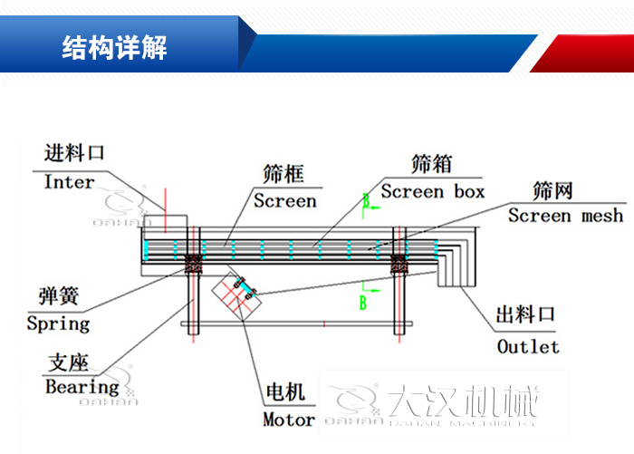 直线筛分机简称直线筛,是一种针对粉状及颗粒状物料筛分的一种振动筛,大汉直线筛分机可以按照用户要求设计成单层或者多层,单层用户简单的除杂,而多层可以对物料进行分级,高层数可以达到5层,另外,还有碳钢和不锈钢两种材质可以供用户选择,适用于筛分0.74mm-10mm,含水量在7%的不含粘性物料的所有干式物料。