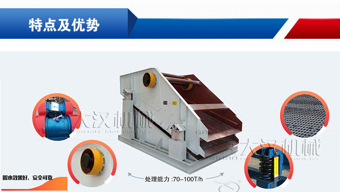 脱水振动筛,简称脱水筛,由于其运动轨迹为直线,所以又称为直线脱水筛。其运动轨迹为直线,是根据JB2444-86《ZSM型煤用座式双轴振动筛》标准和QJ/AK02.06-89《DSM型煤用吊式双轴振动筛》生产的。脱水筛主要针对细粒物料的脱水、脱泥、脱介,可用于砂石料厂水洗砂、选煤厂煤泥回收、选矿厂尾矿干排等,因此也叫砂石脱水筛、矿用脱水筛、煤泥脱水筛、尾矿脱水筛等。筛机处理能力大,筛分效率高。