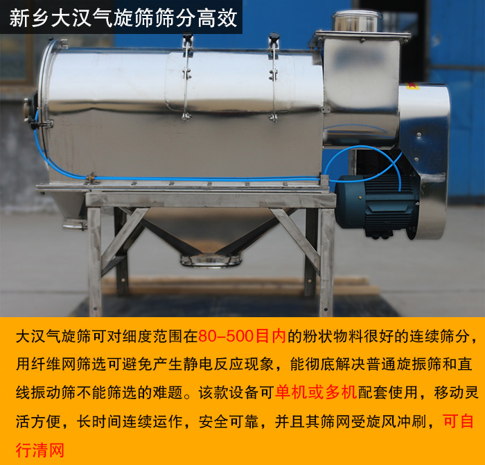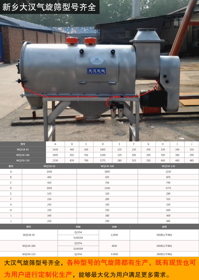 新乡大汉作为知名的气旋筛生产厂家,生产的该设备型号齐全,且各种型号的气旋筛都有生产,既有现货也可为用户进行定制化生产,能够大化为用户满足更多需求。