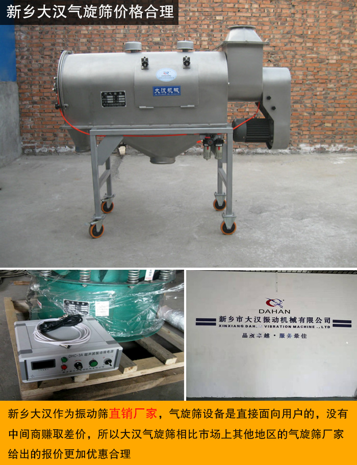 新乡大汉作为振动筛直销厂家,气旋筛设备是直接面向用户的,没有中间商赚取差价,所以大汉气旋筛相比市场上其他地区的气旋筛厂家给出的报价更加优惠合理,减少用户投资成本,有利于用户投资选购。