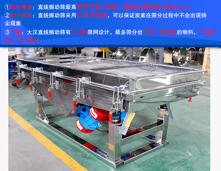 ①筛分精度:直线振动筛高筛分可至400目,筛选分级精度达96%以上。