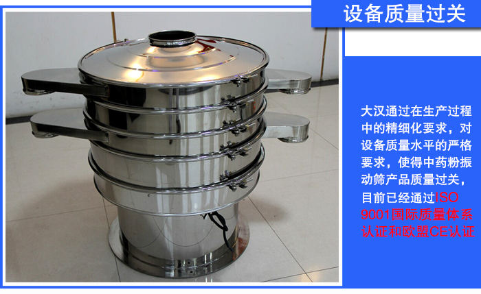 新乡大汉创立20多年以来始终坚信:只有过硬的产品质量才能让企业赢得市场,只有过硬的产品质量才能让企业获得更好的效益,也只有过硬的产品质量才能实现企业的可持续发展。大汉通过在生产过程中的精细化要求,对设备质量水平的严格要求,使得中药粉振动筛产品质量过关,目前已经通过ISO9001国际质量体系认证和欧盟CE认证。