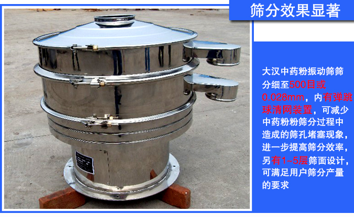 用于中药粉筛分的设备,对其筛分精度要求是非常高的,需要达到好的筛分效果,大汉中药粉振动筛筛分细至500目或0.028mm,内有弹跳球清网装置,可减少中药粉粉筛分过程中造成的筛孔堵塞现象,进一步提高筛分效率,另有1~5层筛面设计,可满足用户筛分产量的要求。