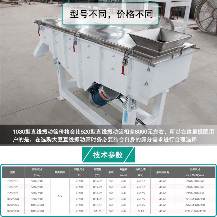 大豆直线振动筛型号不同,其价格也是不同的。不同用户对有大豆筛分产量与精度的要求不同,所以选择的直线振动筛型号也自然是不同的,所以针对不同型号的直线振动筛,其价格会存在差异。1030型直线振动筛价格会比520型直线振动筛相差8000元左右,所以在这里提醒用户的是,在选购大豆直线振动筛时务必要结合自身的筛分需求进行合理选择。