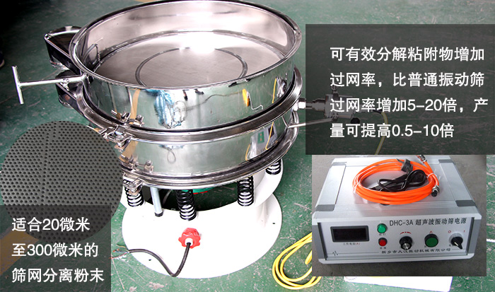 超声波振动筛适合20微米至300微米的筛网分离粉末,对于难处理的物料,其筛分效果尤为显著,超声波振动筛由于添加了超声波筛分系统,相较普通振动筛而言,不仅筛分精度得以提升(可提高1-70%),还可有效分解粘附物,增加过网率,比普通振动筛过网率增加5-20倍,产量可提高0.5-10倍,对于细度较细,且筛分目数要求高的的三氯蔗糖用户来说,使用超声波振动筛无疑是好的选择。