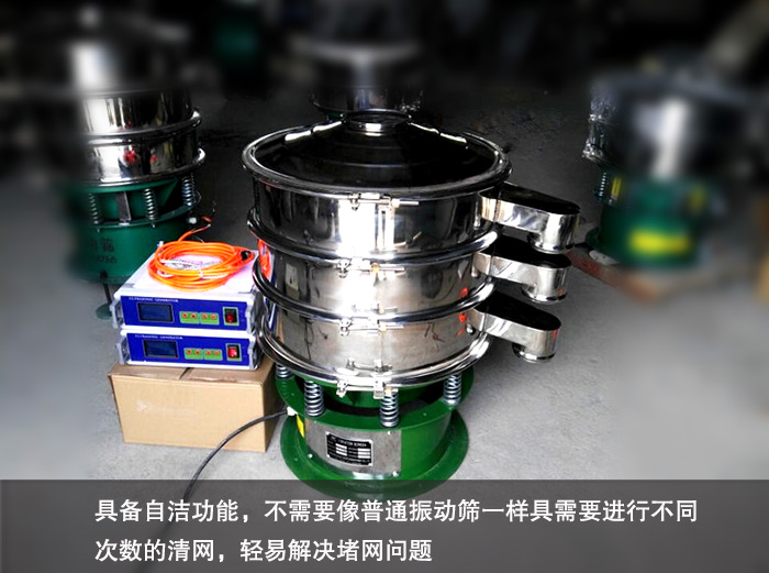 超声波振动筛是在普通旋振筛基础上加装了一套超声波换能系统,在对三氯蔗糖进行筛分时,超声波振动筛将各种常用的低频电能转化为高达38KHz的高频电能,再通过超声换能器,终得到一个38KHz机械振动,使得三氯蔗糖始终保持悬浮状态,即可以提高防止网孔堵塞,也可以提高筛分精度。