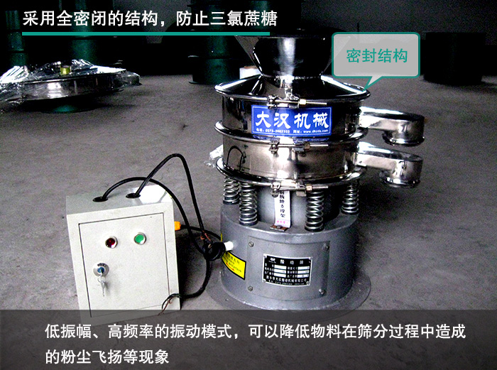 对于三氯蔗糖来说,一是由于其物料特性,二是由于其应用行业,所以在选择振动筛时需要考虑设备的密封性能。