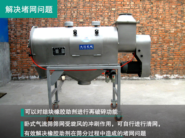 卧式气流筛可以对结块物料进行再破碎功能,特别适合筛分处理轻比重、粘度大、纤维多、有静电、易团聚的超细微粉和特殊物料,而卧式气流筛筛网受旋风的冲刷作用,可自行进行清网,有效解决橡胶助剂在筛分过程中造成的堵网问题。