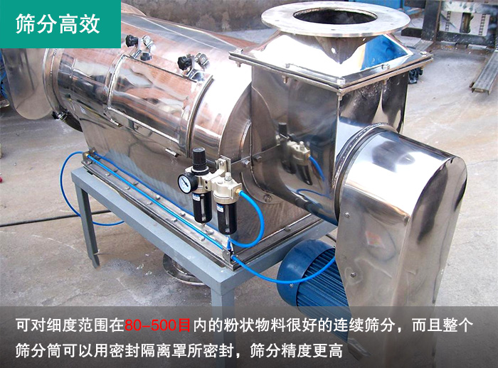 卧式气流筛可对细度范围在80-500目内的粉状物料很好的连续筛分。卧式气流筛整个筛分筒可以用密封隔离罩所密封,避免橡胶助剂在筛分循环过程中的粉尘飞扬,块状分溅等现象,影响筛分精度,而且在达到达到筛分精度的情况下,筛分效率可达到95%以上。