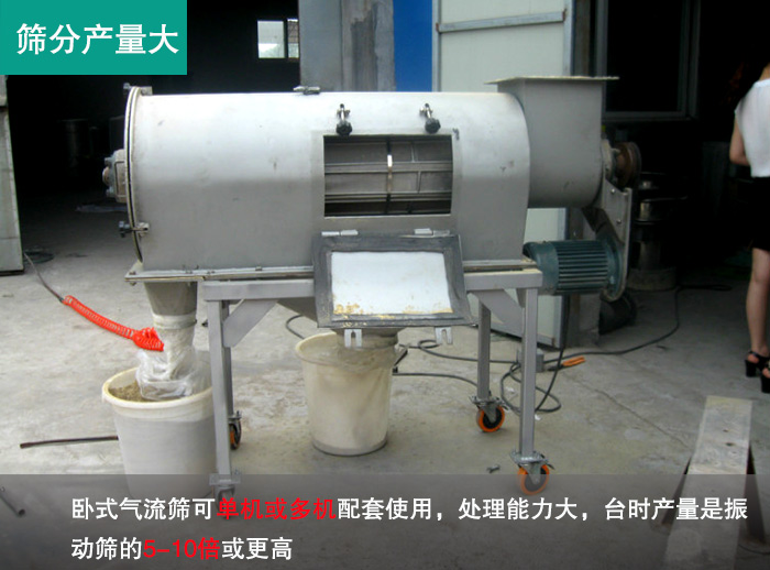 橡胶助剂通过螺旋输送系统后,和气流混合、雾化进入网筒内,通过网筒内风轮叶片使物料同时受离心力和旋风推进力,从而迫使橡胶助剂喷射过网,由细料排出口排出,不能过网的橡胶助剂则沿卧式气流筛网筒壁从粗料排出口排出,筛分效率高。而且卧式气流筛可单机或多机配套使用,处理能力大,台时产量是振动筛的5-10倍或更高。