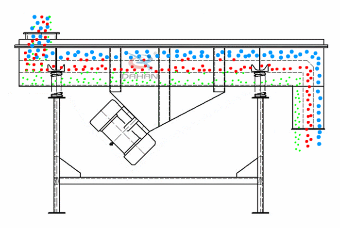直线振动筛对于粉状、颗粒状的物料均可筛选、分级、除杂,它是利用两台振动电机反向旋转,使激振器产生反向激振力,并带动筛箱做前后直线运动,当艾绒从一端的进料口进入筛箱,均匀分布在筛面上,在激振力和艾绒自重的合力作用下,使其在筛面上被抛起,向出料口跳跃式前进,后通过各层孔径大小不一的筛网实现对艾绒的筛分、分级,终由每层对应的出料口排出。