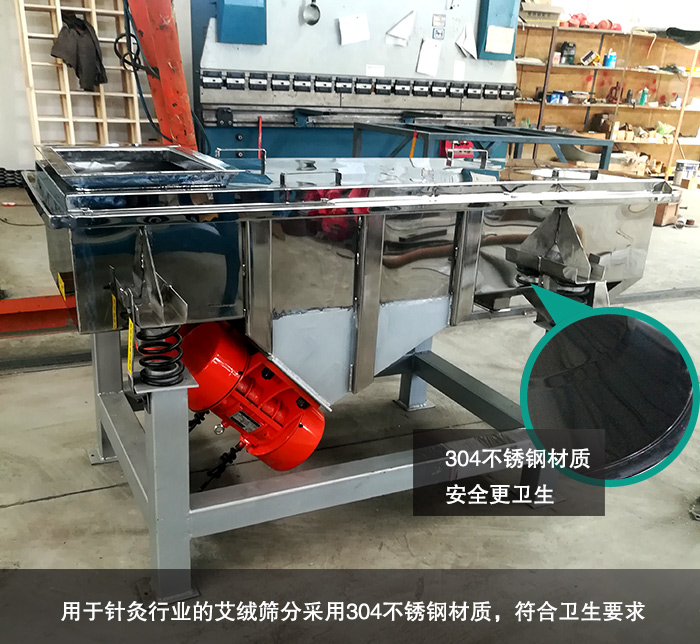 因为艾绒主要用于针灸行业,所以对于卫生要求很高,因此选择的直线振动筛为不锈钢材质,能够保证更加干净卫生。