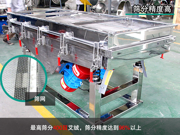 直线振动筛可以高筛分400目艾绒,筛分精度达到96%以上。