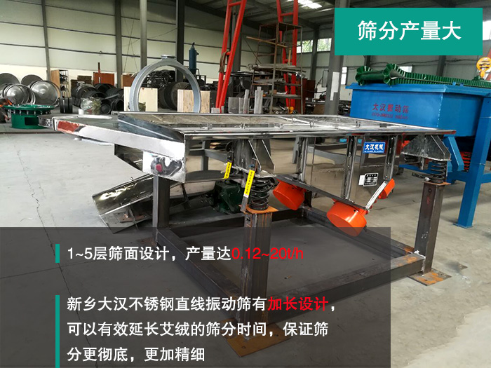 新乡大汉直线振动筛可以有1~5层筛面设计,产量达0.12~20t/h。而且,艾绒在筛分过程中会发生团聚现象,新乡大汉不锈钢直线振动筛有加长设计,可以有效延长艾绒的筛分时间,保证筛分更,更加精细,可以很好地解决艾绒的筛分难题。