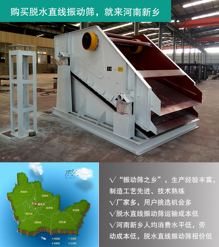 3、河南新乡地理位置优越,铁路,公路交错纵横,脱水直线振动筛运输成本低,可以减少用户的部分投资成本。