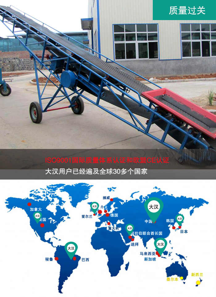 新乡大汉拥有先进生产技术及焊接工艺,专业化技术团队经过多次对移动式皮带输送机进行研究改进,以完善的检测手段和严格的质量管理体系打造出品质优良的设备,赢得了良好的企业信誉,大汉移动式皮带输送机质量通过ISO9001国际质量体系认证和欧盟CE认证,大汉用户已经遍及全球30多个国家,这是值得您信任的合作商。