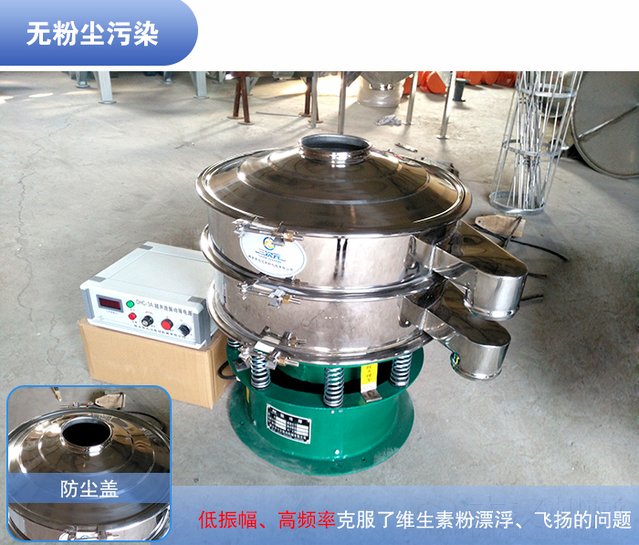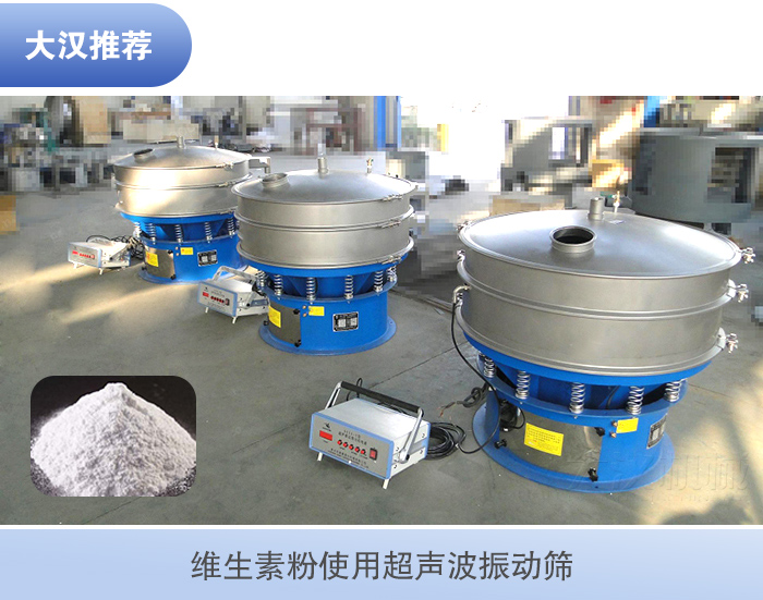 维生素粉属于医药范围,在选择振动筛要选择符合卫生标准,维生素精细目数偏细,为了更好的把控维生素的粒径大小,对维生素粉颗粒进行大小分级,将其中不符合质量要求的粗料、细粒进行筛除,就建议使用超声波振动筛。