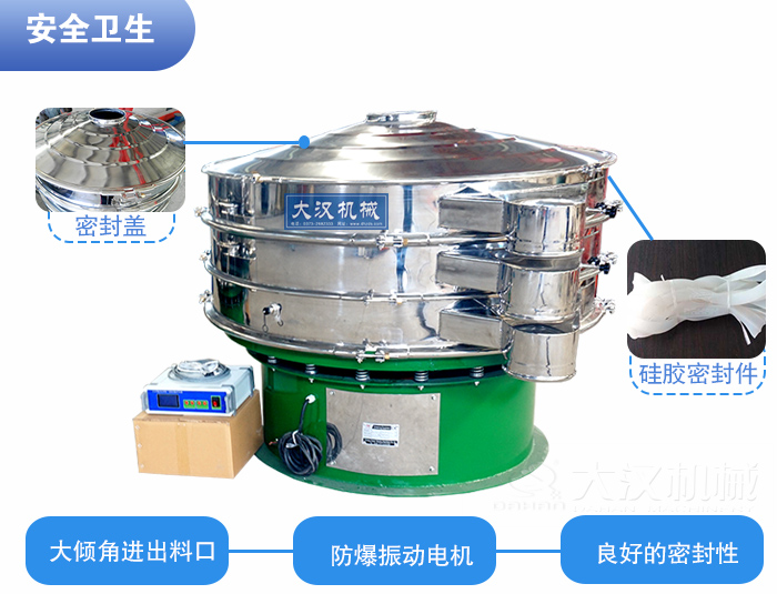 为了保证原材料的卫生情况,维生素粉超声波振动筛要具有良好的密封性,密封件全部采用食品硅胶,网架采用洁净型粘接网架。减震弹簧部分由不锈钢围裙包裹;振动电机可定制为更为安全的防爆振动电机,确保生产安全。考虑到消毒清洗的性和简便性,超声波振动筛的出料口、进料口设计需要采用大倾角设计,更利于清洗和消毒。