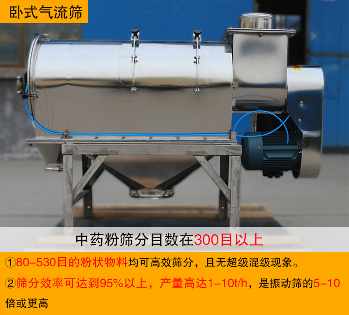 卧式气流筛(气旋筛)摒弃了重力势能作业原理,采用空气作为载体,主要有不锈钢与碳钢两种材质,筛分效率可达到95%以上,产量是振动筛的5-10倍或更高,适应细度范围广,80-530目的粉状物料均可高效筛分,且无超级混级现象,产量高达1-10t/h。卧式气流筛(气旋筛)采用了新式设计,气体保护系统将能净化后空气输至设备两端,能有效地降低设备在运转过程中所产温度对轴承形成气体隔离层,从而杜绝粉尘的进入,有效地延长轴承使用寿命,减少保养频率,提高工作效率。