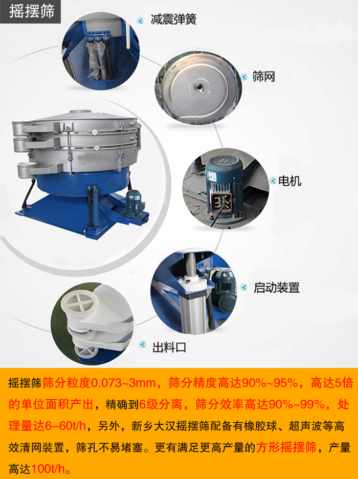 摇摆筛筛分粒度0.073~3mm,筛分精度高达90%~95%,高达5倍的单位面积产出,到6级分离,筛分效率高达90%~99%,处理量达6-60t/h,另外,新乡大汉摇摆筛配备有橡胶球、超声波等高效清网装置,筛孔不易堵塞,可以解决粘性物料在筛分过程中出现的堵网问题。
