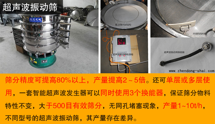 在解决粘性物料堵网问题的情况下,大汉超声波振动筛而且精度可提高80%以上,产量达到1~10t/h,不同型号的超声波振动筛,其产量存在差异。