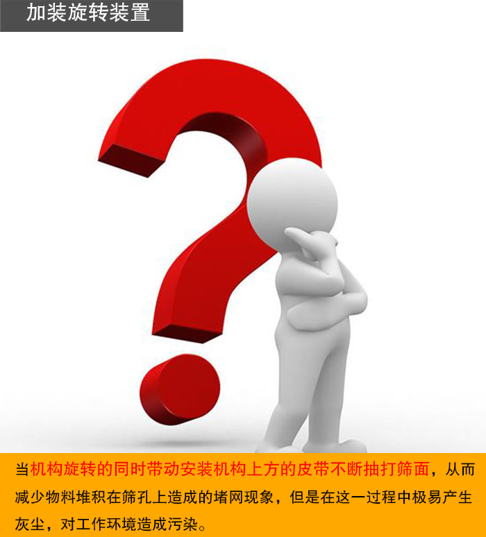 滚筒筛在其固定机架上加装带皮带的旋转装置,当机构旋转的同时带动安装机构上方的皮带不断抽打筛面,从而减少物料堆积在筛孔上造成的堵网现象,但是在这一过程中极易产生灰尘,对工作环境造成污染。