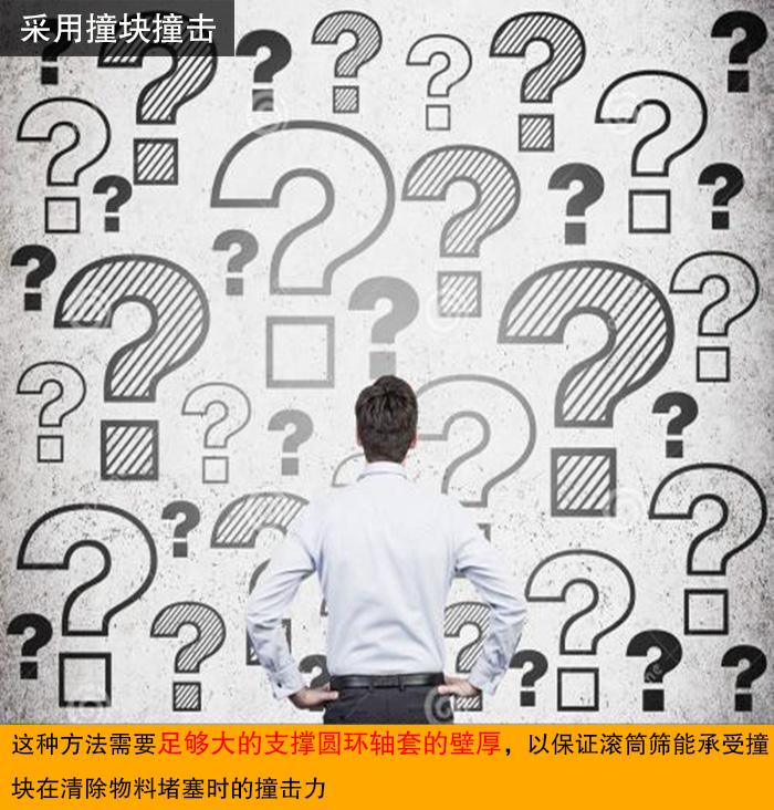 滚筒筛堵网还可以采用撞块撞击,但是这种方法需要足够大的支撑圆环轴套的壁厚,以保证滚筒筛能承受撞块在清除物料堵塞时的撞击力。