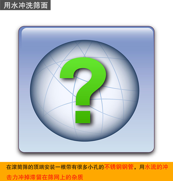 还可以在滚筒筛的顶端安装一根带有很多小孔的不锈钢钢管,用水流的冲击力冲掉滞留在筛网上的杂质。