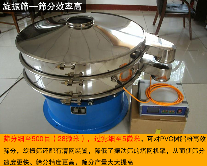 旋振筛可以筛分过滤颗粒,细粉,浆液的物料,既可粗略分级,又可精细筛分或者过滤,筛分效率高,根据实际生产需要可单层或多层使用,全封闭结构,无粉尘溢散,筛网不阻塞、粉末不飞扬、筛分细至500目(28微米),过滤细至5微米,可对PVC树脂粉高效筛分,旋振筛还配有清网装置,降低了振动筛的堵网机率,从而使筛分速度更快、筛分精度更高,筛分产量大大提高。