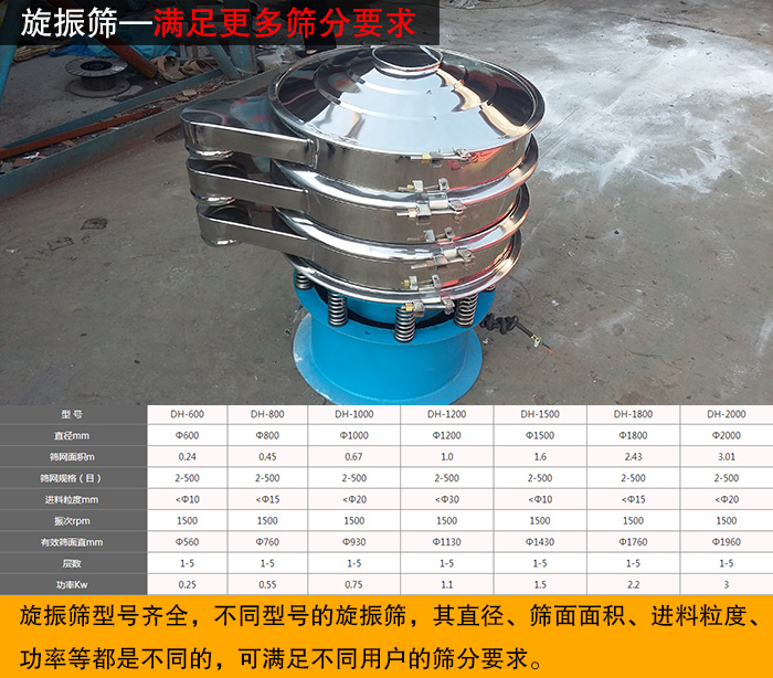 旋振筛型号从DH-600、DH-800、DH-1000、DH-1200、DH-1500、DH-1800、DH-2000,不同型号的旋振筛,其直径、筛面面积、进料粒度、功率等都是不同的,可满足不同用户的筛分要求。