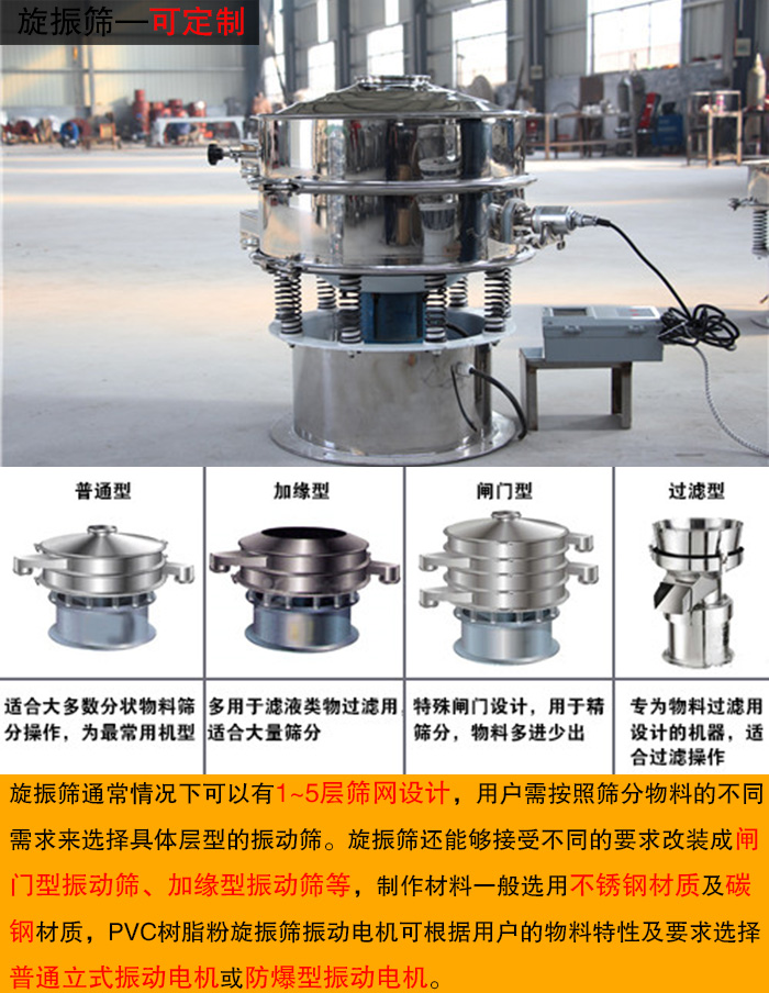 通常情况下,旋振筛通常情况下可以有1~5层筛网设计,用户需按照筛分物料的不同需求来选择具体层型的振动筛。旋振筛还能够接受不同的要求改装成闸门型振动筛、加缘型振动筛等,制作材料一般选用不锈钢材质及碳钢材质,PVC树脂粉旋振筛振动电机可根据用户的物料特性及要求选择普通立式振动电机或防爆型振动电机。