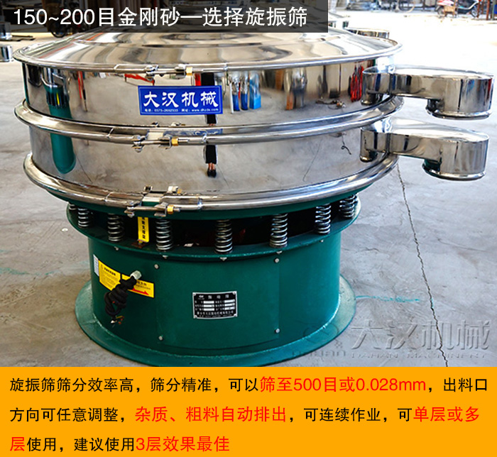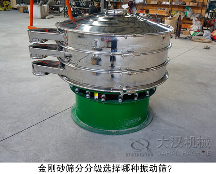 不同目数的金刚砂,选择的振动筛是不同的,金刚砂粗目(8~10目),中目(150~200目),细目(300目以上)三大类,针对不同目数的振动筛,大汉厂家推荐以下3种类型的振动筛。