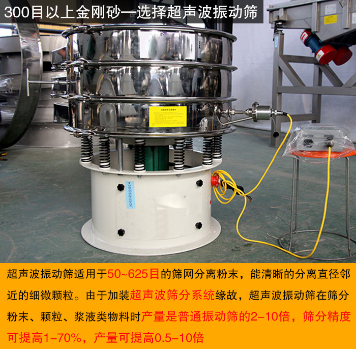 对于300目以上特别细的金刚砂微粉来说,可以选择超声波振动筛。
