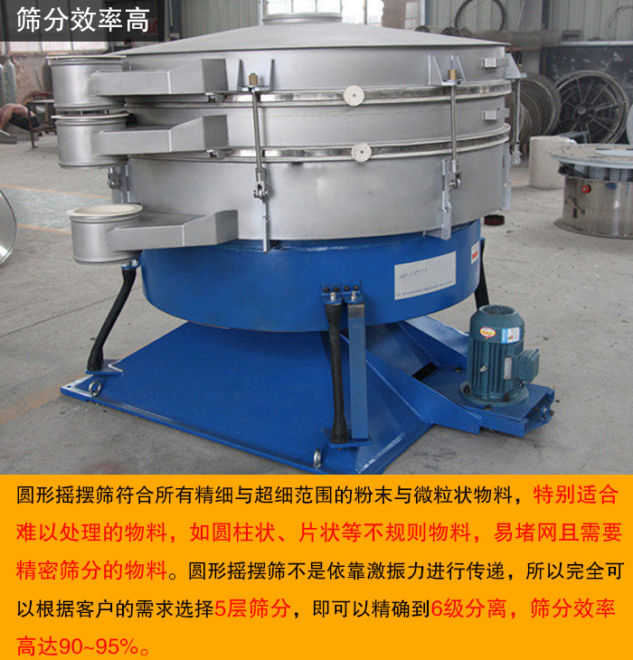 圆形摇摆筛符合所有精细与超细范围的粉末与微粒状物料,特别适合难以处理的物料,如圆柱状、片状等不规则物料,易堵网且需要精密筛分的物料。圆形摇摆筛不是依靠激振力进行传递,所以完全可以根据客户的需求选择5层筛分,筛分效率高达90~95%。