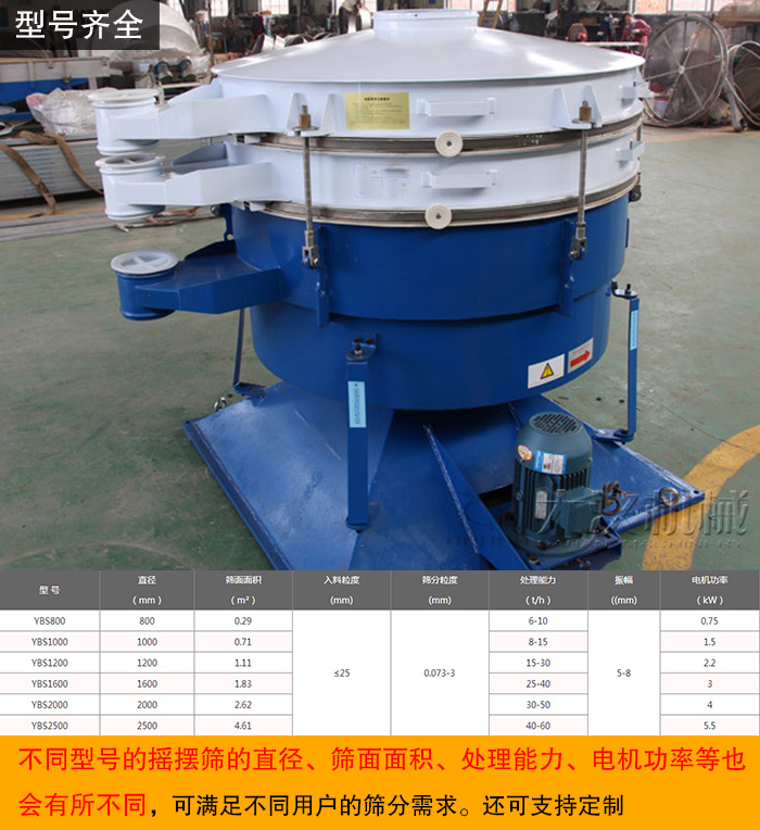 圆形摇摆筛主要型号有YBS-800、YBS-1000、YBS-1200、YBS-1600、YBS-1800、YBS-2000、YBS-2500,不同型号的摇摆筛的直径、筛面面积、处理能力、电机功率等也会有所不同,可满足不同用户的筛分需求。还可支持定制。